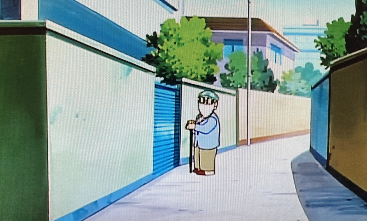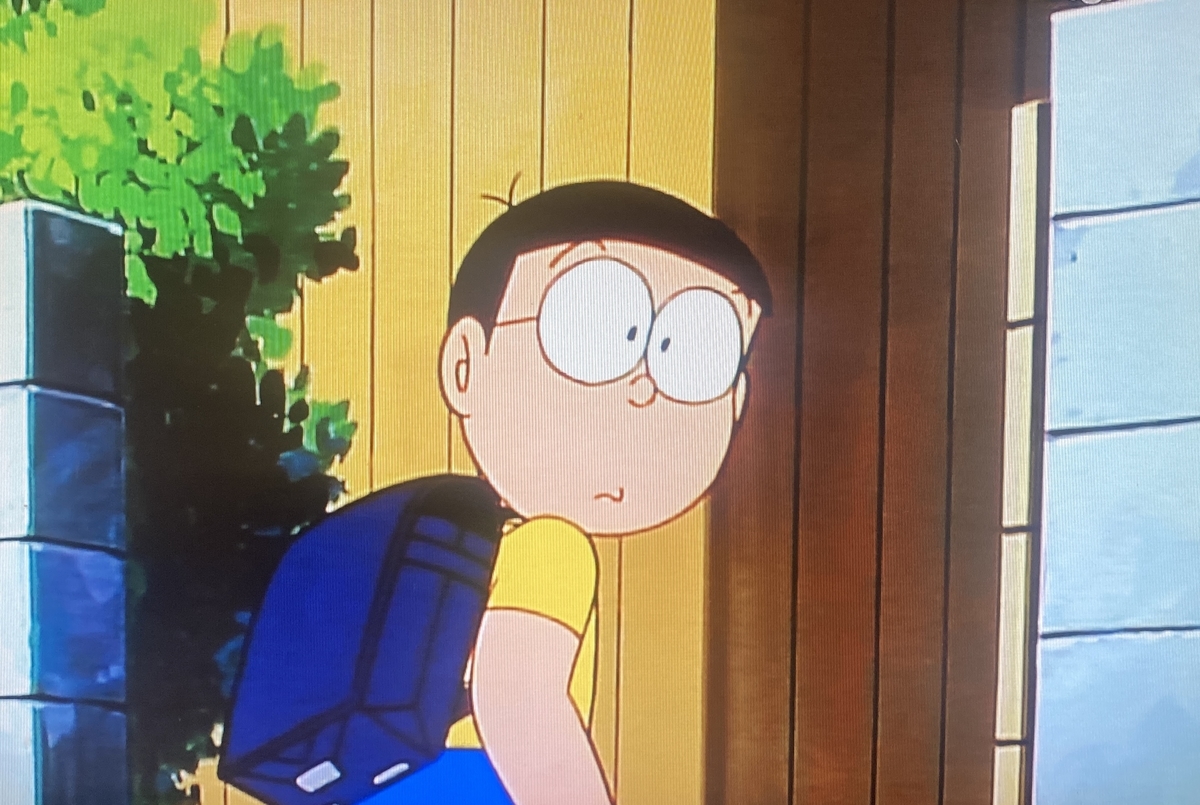 冒頭、怪しいおじさんい気付くのはのび太でした。