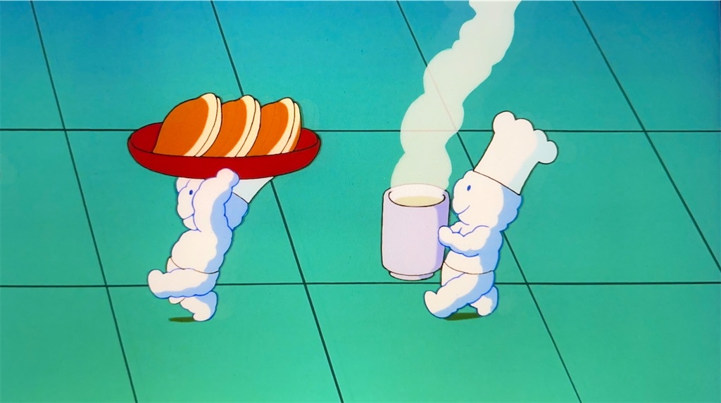 この少し後には朝食シーンもありましたね。ドラえもんは相変わらずどら焼きを食べていましたが、のび太サイドには目玉焼きとパンらしき物体が確認できます。